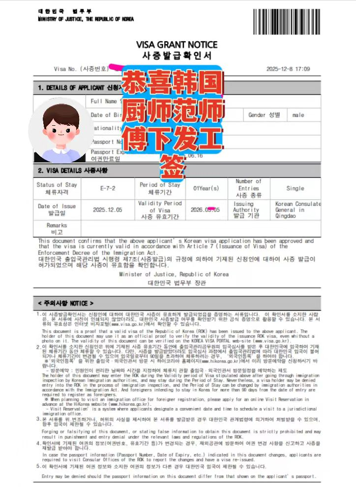 恭喜范師傅韓國廚師工作簽證成功下發(fā)!歷經(jīng)材料審核、雇主匹配、領(lǐng)館審批等全流程,正規(guī)廚師簽證順利到手,即將開啟赴韓高薪工作之旅~